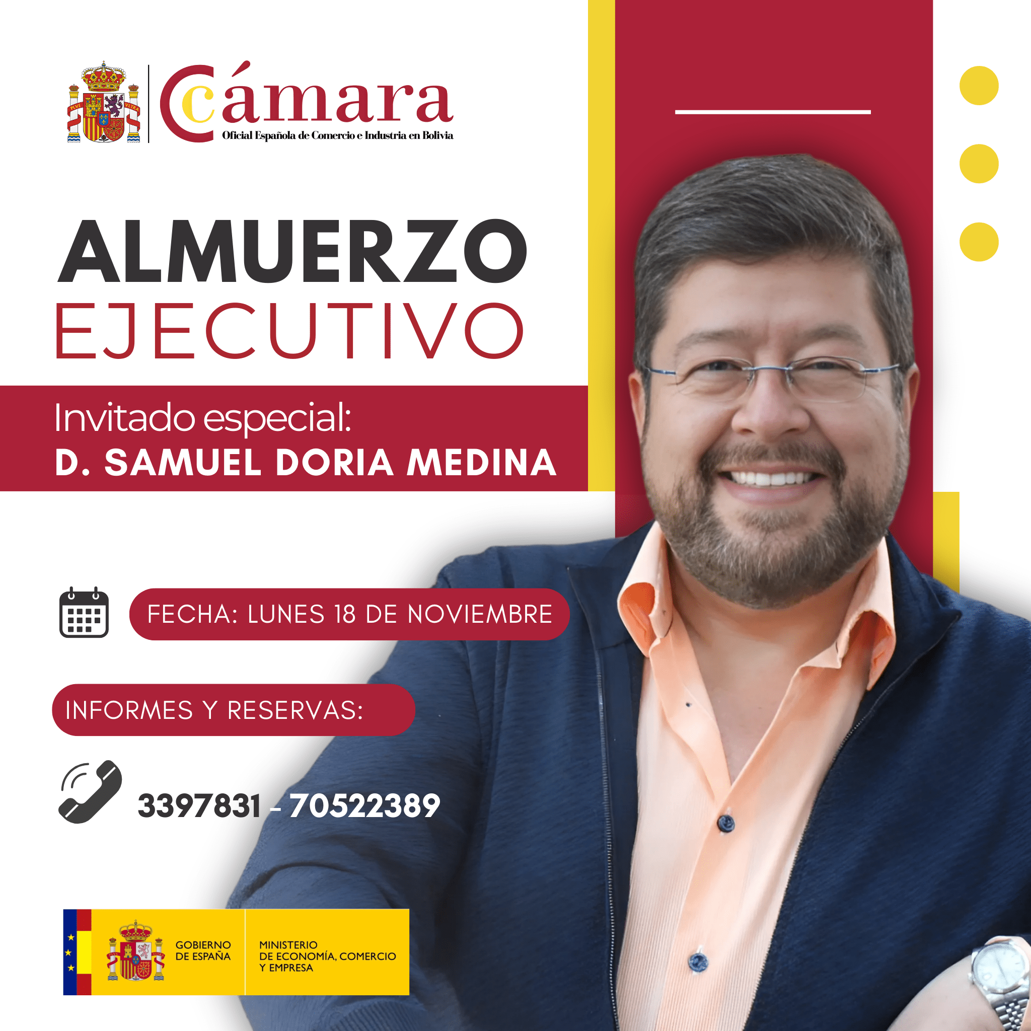 El próximo lunes 18 de noviembre del presente año, en la ciudad de Santa Cruz, estamos organizando un Almuerzo Networking con el Sr. Samuel Doria Medina, reconocido empresario boliviano, emprendedor e inversionista, candidato en varias ocasiones a la presidencia de Bolivia, quien en la oportunidad nos dará a conocer de primera mano, su punto de vista acerca de la actual coyuntura económica, su visión política país y alternativas de salida. Además, para este almuerzo tenemos confirmada la presencia de nuestro Embajador.
