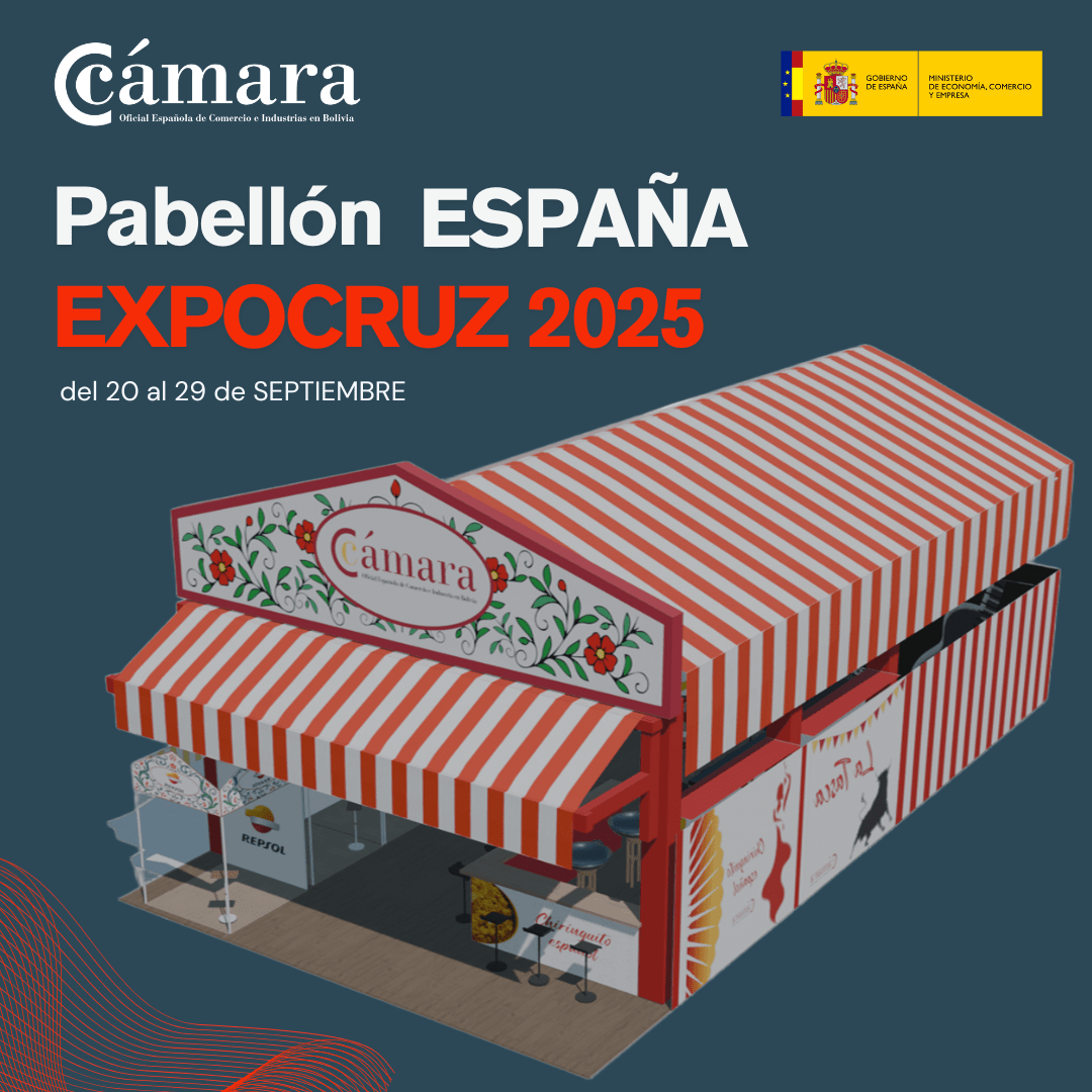 La Cámara Oficial Española de Comercio e Industria en Bolivia, invita a todas las empresas socios de la Cámara, españolas con presencia o interesados en el mercado boliviano, a formar parte del PABELLÓN ESPAÑA de la EXPOCRUZ 2025.